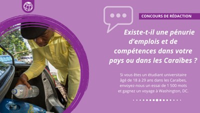 Nous lançons un concours régional de rédaction pour les jeunes dans la Caraïbe, âgés de 18 à 29 ans, afin de partager leurs idées sur la pauvreté et le développement. Ce concours offre aux étudiants de niveau universitaire une plateforme pour proposer des solutions et contribuer aux discussions sur le développement durable, la croissance économique et la résilience dans la région.
