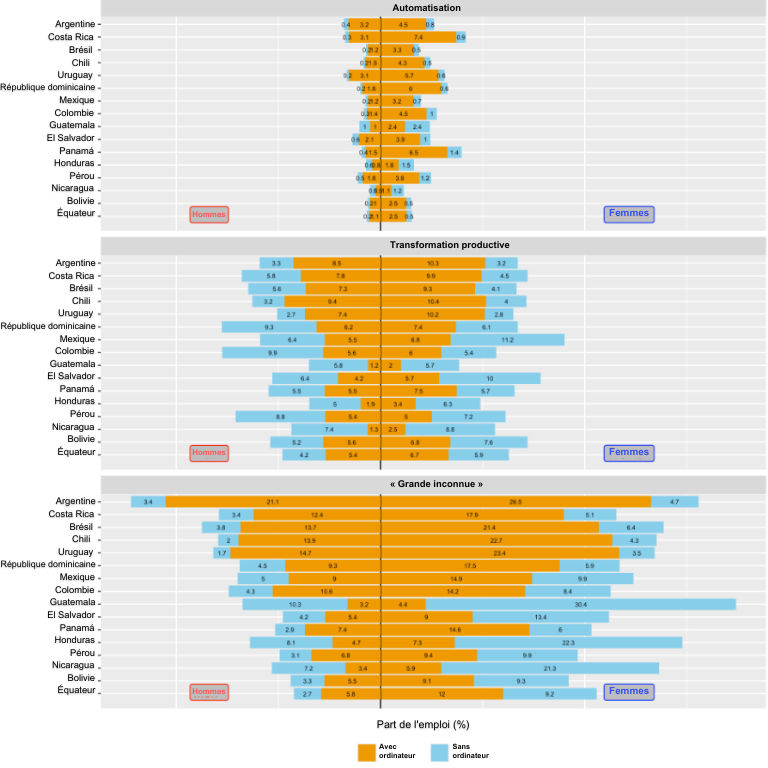 Les personnes les plus exposées à l’automatisation de leur emploi par l’IA-Gen sont les femmes, les travailleurs des zones urbaines, les plus jeunes, les non pauvres, les salariés de secteurs formels (en particulier la banque, la finance ou l’administration publique), ou encore les individus qui ont fait des études supérieures. Cette automatisation, donc la destruction potentielle d’emplois bien rémunérés, formels et qualifiés dans des secteurs où l’emploi féminin est majoritaire, aurait des conséquences néfastes sur les économies déjà très informelles et inégalitaires de la région.